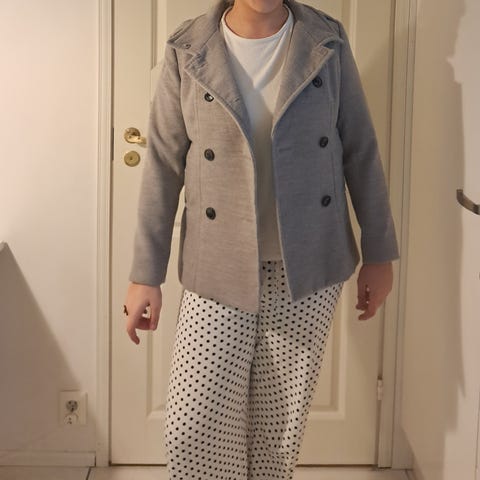 Villakangastakki, koko lapussa 44. Kainalo-kainalo 54cm. Olka-hihansuu 66cm. Takin pituus 95cm. Koiratalous.