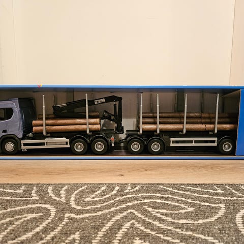 UUSI Scania CS tukkirekka hopeanvärisellä kotkankuvalla. Vetoautossa on takapyöräjousitus ja tuulispoileri sekä 2-akselinen peräkärry. Tukkien lisäksi liikuteltavat pankot, tukkinosturi sekä peilit.