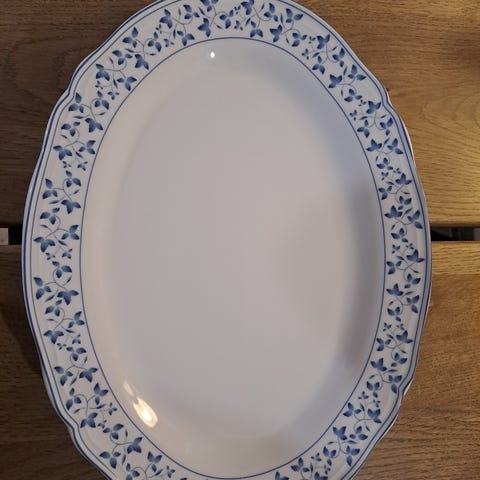 Valkoiset sinisillä kukilla koristetut tarjoilulautaset. Toisessa pieni musta jälki.