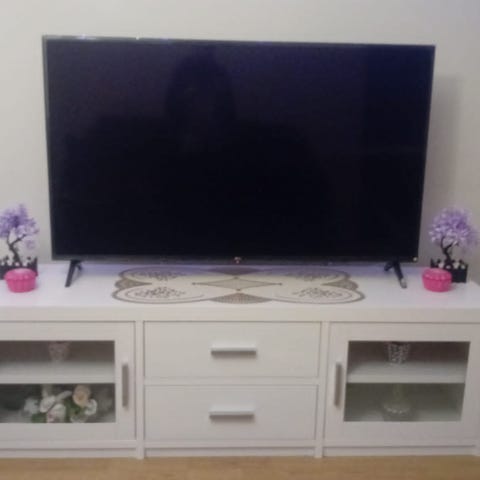 Hyväkuntoinen valkoinen TV koroke TV-tason päälle nostamaan television katselukulmaa.
