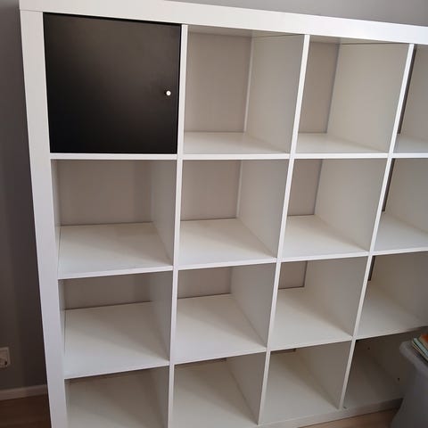 Keskimmäinen valkoinen hylly kiinteä, muiden korkeutta voi säätää. Taustalevy on.