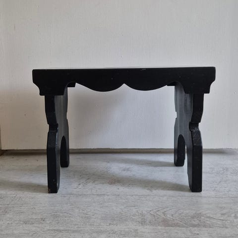 Tummanruskea Ilmari Tapiovaaran pirttikalusto: pöytä 120x69cm ja 2 penkkiä. Jalat mustat. Pöytä on alkuperäistä tuotantoa, hyväkuntoinen, penkit uusia (valmistettu n.10v sitten).