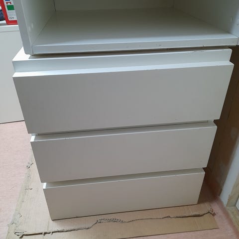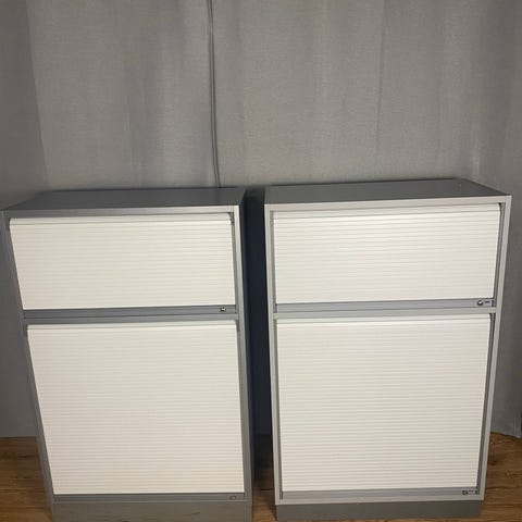 Rullakkokaappi ja vetolaatikko, joka kolmeosainen. Mukana avaimet, jolla molemmat saa lukittua. Käytössä pientä kulumaa, muuten loistava kunto.