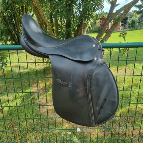 Pitkäselkäisellä shettiksellä käytössä ollut nahkainen satula. Paneelit 40 cm. Istuu kaarevahkoon/takaa nousevaan selkään. Satulassa toppaukset kovat ja vaatii kunnostuksen tai ainakin paksun pädin väliin. Muuten hyväkuntoinen, mukaan vyö ja häntäremmi.