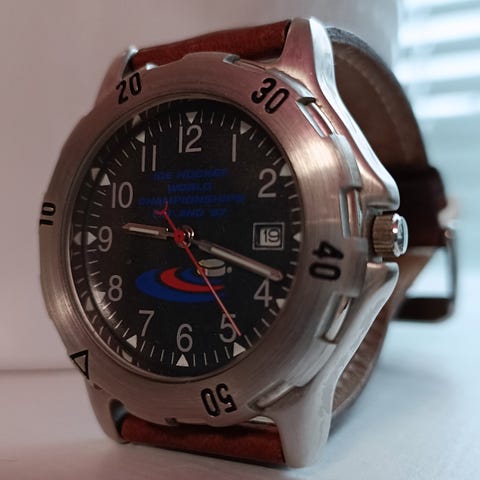 Kello-Mäkinen Ky seinäkello, jossa on sininen muovikehys ja jääkiekkoaiheinen kellotaulu. Kellossa on perinteinen viisari ja sekuntiviisari. Takapuolella on mekaaninen osasto.