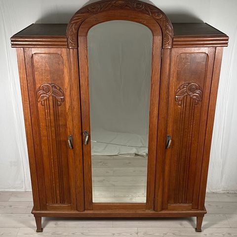 Tuotenumero: Koristeellinen, todella kaunis antiikkivaatekaappi. Kaappi koostuu yhdestä vetolaatikosta ja koukuista. Halutessaan tähän voi asentaa myös vaatetangon. Keskimmäisessä ovessa on todella hyvässä kunnossa oleva alkuperäinen fasettipeili. Sisällä oleva vihreä kangas on mahdollisesti alkuperäinen ja sen voi halutessaan irrottaa niin että puu tulee esille. Vaatekaappi menee kolmeen osaan, joten kuljettaminen on todella helppoa. Kokonsa ansiosta tämä kaappi sopii todella hyvin eteiseen tai pienen tilaan.