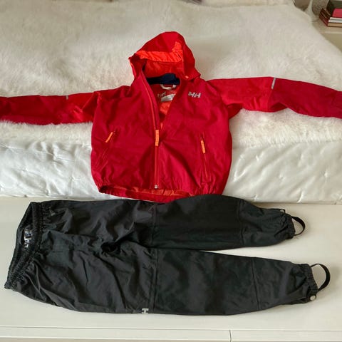 Helly Hansen lasten kuoritakki ja kuorihousut.