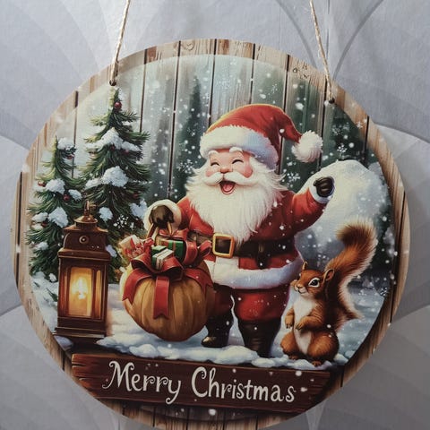 Uusi, retro joulu taulu joulupukki Korvatunturilla . Puinen taulupohja, halkaisija 20 cm . Jouluinen tunnelman ja muistojen tuoja.