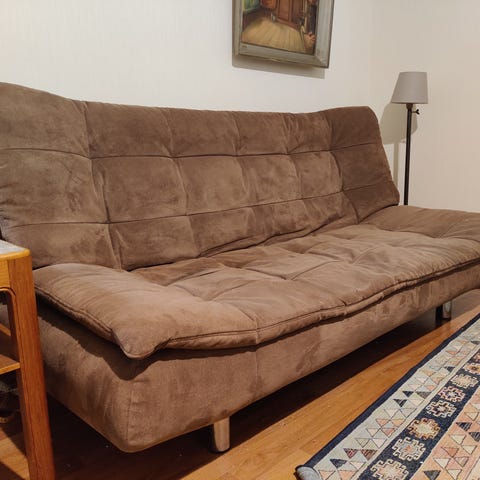 Annetaan tai vaihdetaan nojatuoliin Finsoffien ruskea vuodesohva. Kolmen istuttava. Kangas käsinojasta rispaantunut ja toisessa selkätyynyssä pieni koiran tekemä reikä.