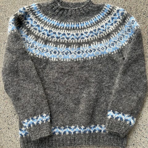 Myydään hyväkuntoinen villapaita, 100% villaa, islantilaisesta Léttlopi- langasta. Väri beige, valkoista ja vaaleansinistä. Koko S, menisi varmaan myös kokoa M käyttävälle. Jokunen pieni virhe näyttää eksyneen neulokseen.