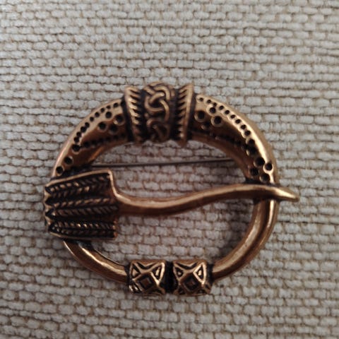 Koristeellinen solki, jossa on yksityiskohtainen muotoilu ja suomalainen valmistusmerkintä.