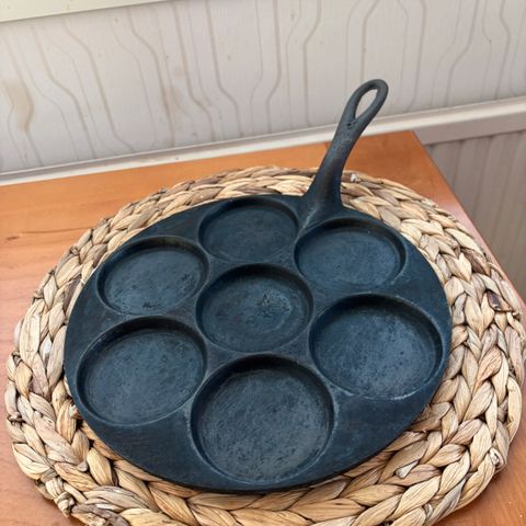 Valurautainen grillipannu, jossa on puinen kahvat ja kaatomahdollisuus molemmilla puolilla.