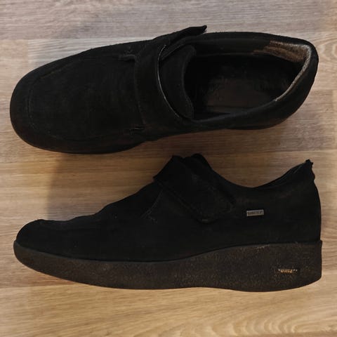 Mustat mokkanahka kengät, tarrakiinnitys. Goretex, pitävä pohja. Erittäin siistit ja hyväkuntoiset. Postitus ok.