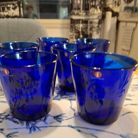 Iittala sininen lasiastiasarja, lautaset ø 21cm ja juomalasit 21cl tai 40cl. Lautasissa näkyy käytön jälkiä, kuten naarmuja ja pieniä vaurioita. Vain nouto Etelä-Haagasta, maksu käteinen tai mobilepay.