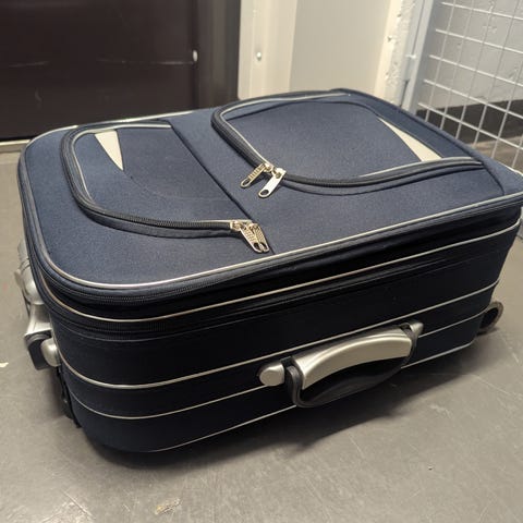 Lightweight black suitcase that is perfect for small, short-distance travels, or simply for storage. A bit of wear and tear visible at the bottom of the suitcase.