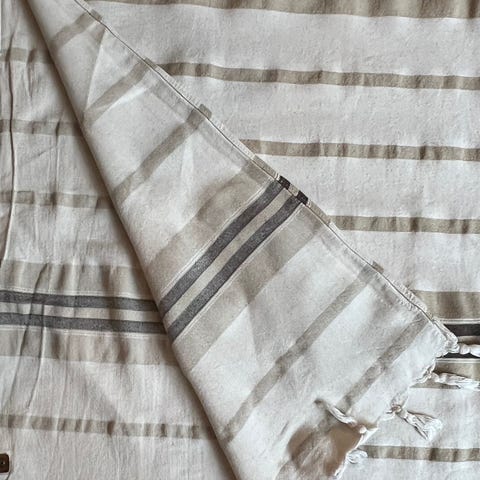 Kreikasta tuliaisina tuodut puuvillaiset sisustustyynyliinat ja kaitaliina.