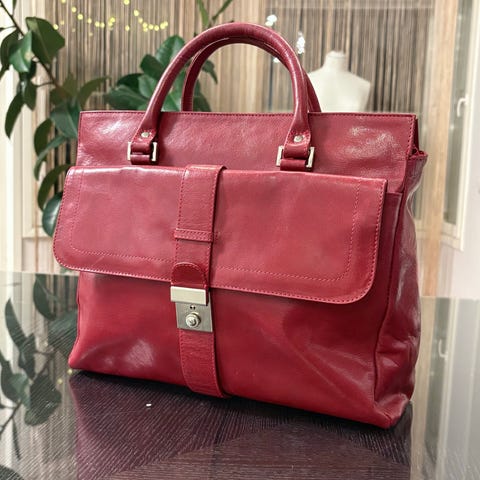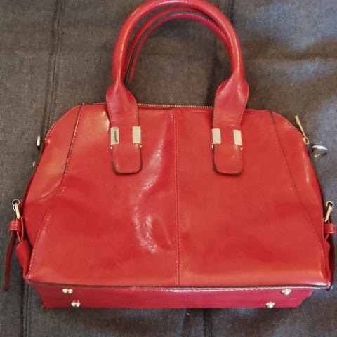 Marengo Fashion merkkinen iso punainen nahkainen laukku. Aitoa nahkaa. Sisällä ison osion lisäksi vetoketjullinen tasku sekä pieni avoin tasku. Ulkopuolella lisäksi vetoketjullinen tasku. Laukku on todella hyvässä kunnossa, siisti ja ehjä sekä hajuton.