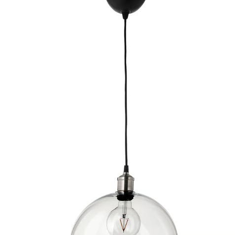 IKEA riippuvalaisin, jossa on musta metallikehys ja kirkas lasikupu. Setti sisältää kolme valaisinta, jotka on suunniteltu ripustettavaksi kattoon. Sopii esimerkiksi keittiön tai ruokailutilan valaistukseen.