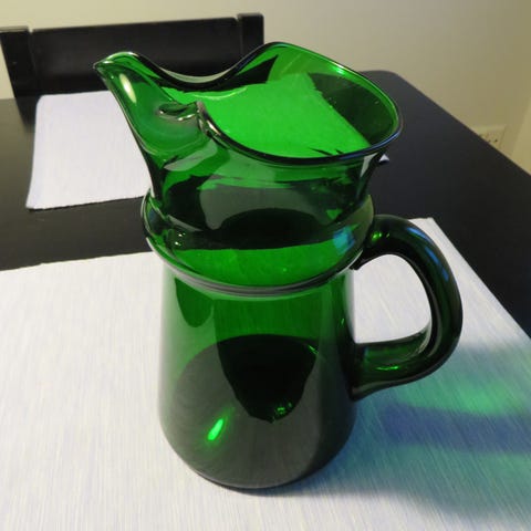 Lasikannu / kaadin. Kirkasta lasia. Kahva ja kaatonokka. Korkeus 24 cm, läpimitta 9 cm. Kyljessä hiottuna heinäkasvin kuvia.