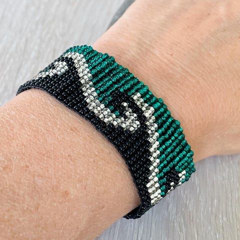 Myydään näyttävät ja uniikit helmikorvakorut, joissa geometrinen kuviointi ja värikäs helminauha. Korvakorut on valmistettu pienistä helmistä, joissa punaisen, keltaisen, vihreän, mustan ja oranssin sävyjä. Alareunassa roikkuu kauniit helmihapsut, jotka tuovat liikettä ja eloa koruihin. Sopivat täydellisesti boheemiin tyyliin, festareille tai lahjaksi!