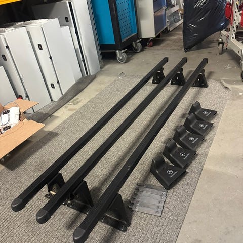 Thulen kattotelineet 2kpl sprinteriin työvaloilla, sopinee vm 95-06 sekä samanikäseen wv lt. Yksi kiristinrulla on hukkunut, muutoin täysin kunnossa.