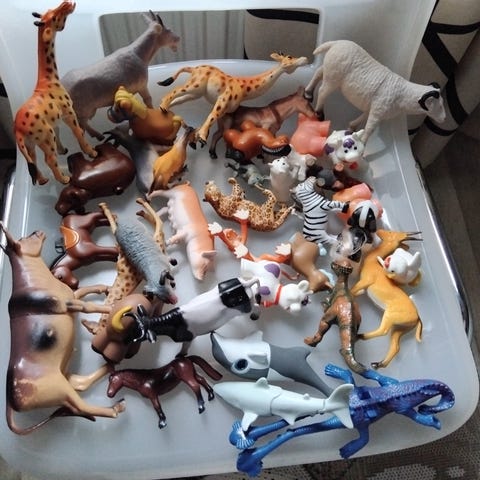 Erilaisia eläinhahmoja sisältävä lelukokoelma, jossa on muun muassa norsu, tiikeri, kirahvi, hai, hevonen ja muita eläimiä. Lelut ovat eri kokoisia ja värisiä, valmistettu muovista. Soveltuvat lasten leikkeihin ja eläinaiheiseen leikkiin.