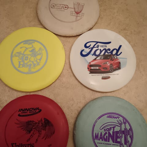 Useita frisbeegolfkiekkoja eri väreissä ja malleissa. Kerro mitä tarvitset niin katotaan, mitä asialle pystytään
