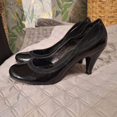 Kiiltonahkaiset mustat korkokengät kiilakorolla, koko 39,5-40 (US 9). Korko 5 cm. Kengät ostettu USAsta. Merkki Bandolino. Hyvä käytetty kunto, näitä on käytetty vain muutamia kertoja juhlissa. Mukavat jalassa!
