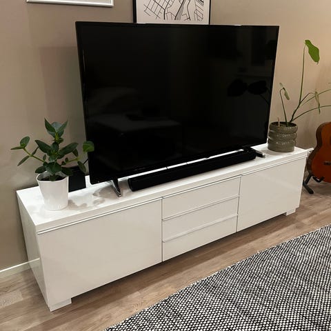 Ikean mustanruskea bestå tv-taso, tähän lisätty myöhemmin bauhaussin kalustejalat. Keskellä kaappi, sivuilla laatikot