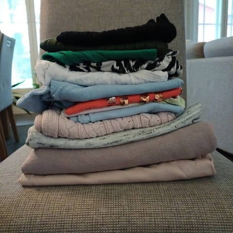 Vaatteet ehjät ja erinomaisessa kunnossa, säilytyksessä rypistyneet. Suurin osa vaatteista H&M ostettu. Kaikki yhteensä 45e.