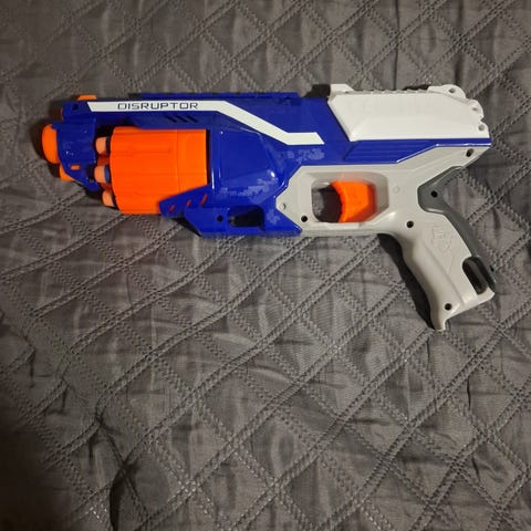 Nerf pyssy lisäosilla ja 6 panoksen lippaalla.