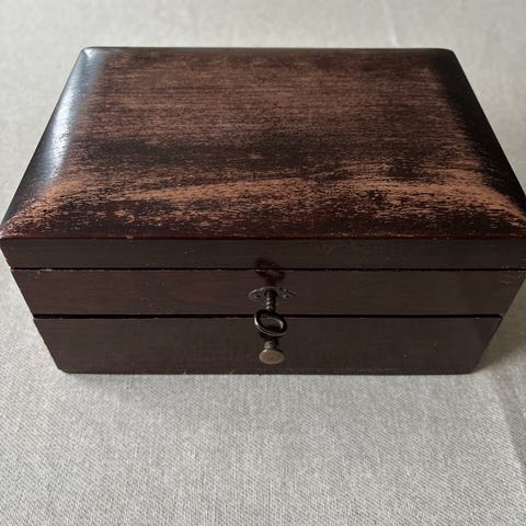 Vintage 40- luvulta puinen säilytysrasia,käsin maalattu .Korkeus 5 cm,leveys 18 cm 24+ postitus 6