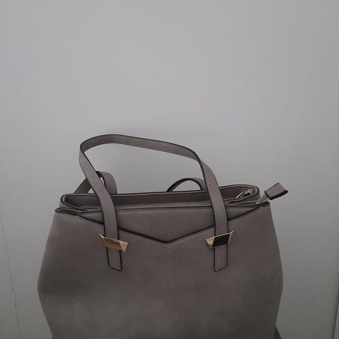 Pehmeää materiaalia (keinonahka) ja lämpimän vaalean harmaa/kaoliinin värinen käsilaukku.
