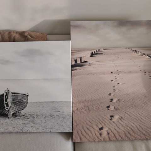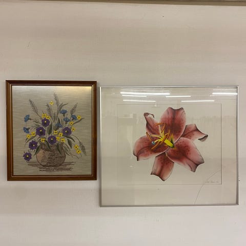 Kolme taulua. Isoin 65 x 82 ja kaksi pienintä 65 x 38,5. Toisen pienen yläkulma hieman auennut, muuten taulut hyvässä kunnossa.