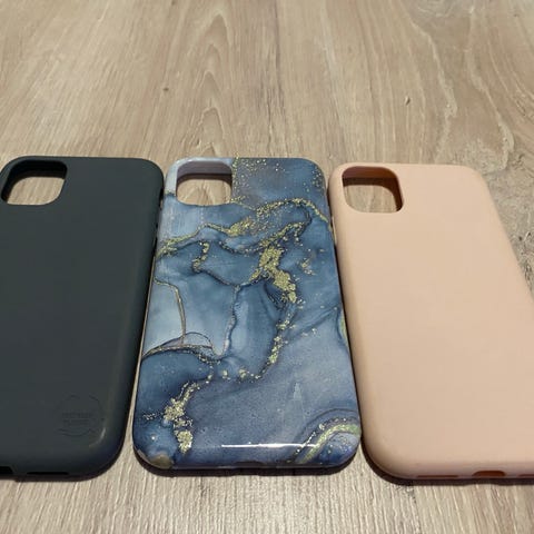 3x puhelinkuoret, iPhone 11. Läpinäkyvät käyttämättömät, liilat hieman käytetyt, mutta hyväkuntoiset ja keltaisissa hieman käytön jälkiä (kuvat).