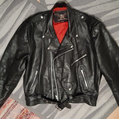 Muutaman kerran pidetty takki, aitoa nahkaa. Kuvien "malli" on 173cm, 105kg ja kohtuudella harteikas (sekä vatsakas).