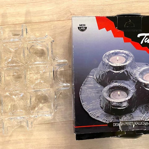 Valmistaja Muurlanlasi, suunnittelija Simo Tawasti. Tämä "Joulukenno" sopii tuikkujen ja koristeiden esillepanon lisäksi hyvin myös pikkuherkkujen tarjoiluun. Vain nouto. Hinta 6€.