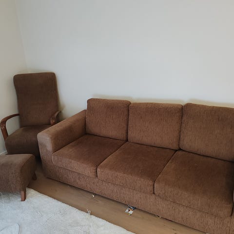 Kolmen istuttava, levitettävä sohva + 2 nojatuolia. Myydään tilanpuutteen vuoksi. Nopea haku!