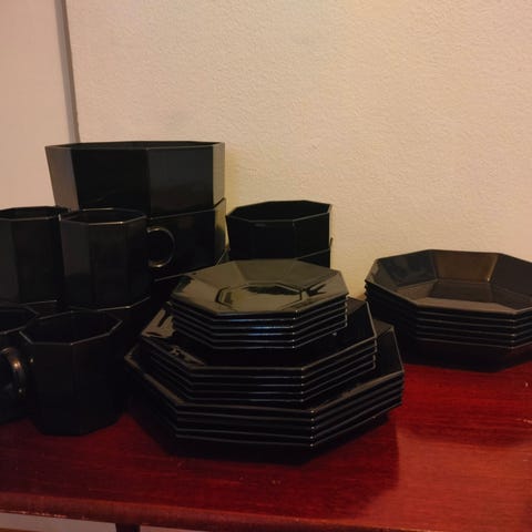 Osa ainakin Arcoroc sarjaa. Lautasessa pikkuista käytön jälkeä. Muut taitavat olla käyttämättömiä.