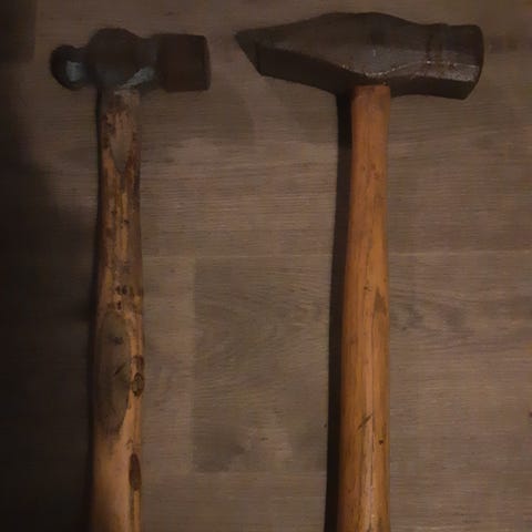 Sarja vanhoja vasaroita, joissa on metallipäät ja puiset kahvat. Vasaroiden mallit ja koot vaihtelevat. Käytettyjä työkaluja, jotka soveltuvat erilaisiin lyönti- ja purkutöihin.