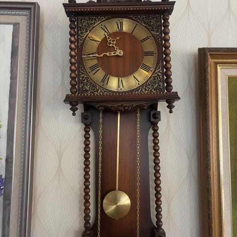 Laadukas Wehrle-seinäkello , joka on valmistettu puusta, ja siinä on koristeelliset puupylväät sivuilla. Kellotaulu on kullanvärinen ja siinä on roomalaiset numerot. Siinä on kaksi painoa ja heiluri, jotka ovat ketjujen varassa.