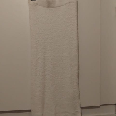 Luonnonvalkoinen vuoritettu neulehame, jossa on leveä kuminauhakuja vyötäröllä. Tästä ei löydy mitään tuoteselostetta, mutta pinnan kiillosta ja pienen pienestä eloisuudesta päätellen materiaali saattaisi olla viskoosia, jota on himpun verran terästetty jollain karkeammalla kuidulla, esim. pellavalla.