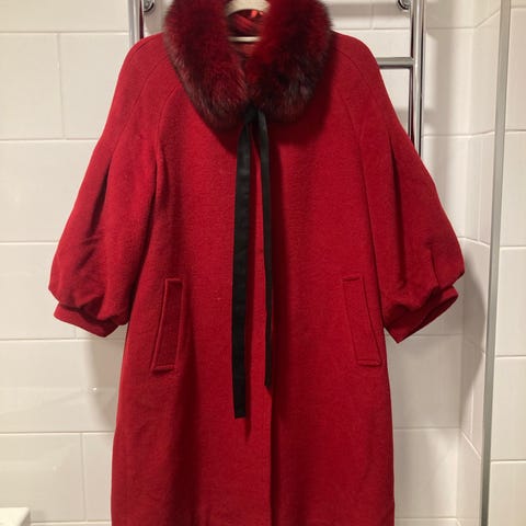 Puolipitkä villakangas takki. Tumma punainen/ liila. Aito turkki, kaulan ympärille kokom, mutta sopihyvins sja pienellekokoiselle.