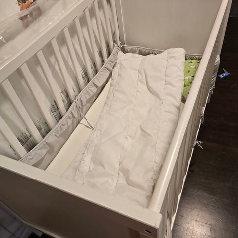 Uutta vastaava, vain yhdellä lapsella vajaan vuoden käytössä ollut Storkcraft pinnasänky ja Ikea Pelleplutt patja. Patjan suojuksessa on hieman värjäymää toisella puolella, joka ei lähde pesussa pois. Tämä ei kuitenkaan vaikuta käytettävyyteen ja jää piiloon patjansuojuksen ja lakanan alle.