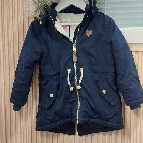 Vuorillinen toppatakki pehmeää puuvillaista vakosamettia. Pörröinen taitekaulus. Etupuolella painonapitus ja läppätasku . Koko 98, 2- 3 vuotialle.