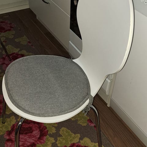 Neljä valkoista tuolia, joissa muovinen istuinosa ja puiset jalat. Mukana harmaat istuinpehmusteet. Sopii esimerkiksi ruokailutilaan tai työpisteeseen.
