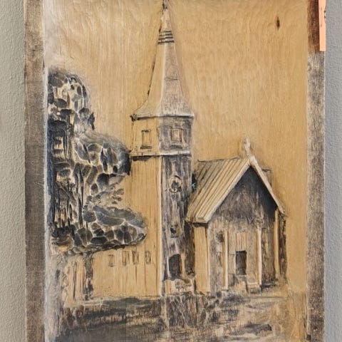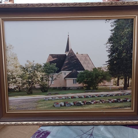 F. H. mahdollisesti käsin maalattu valokuva "Vihdin Pyhän Birgitan kirkko". Lasikehyksen korkeus on 31 cm ja leveys 32 cm.