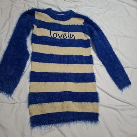 Hinta postitettuna 25 euroa, kokoarvio 140 - 150, olka - helma 46 cm, kainalo - kainalo 47 cm, pääväri ruskea, helma, kaula-aukko ja hihansuut vaaleanpunaiset, mohair nyppyjä saattaa löytyä,