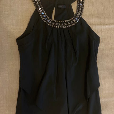 Naisten Pola merkkinen musta hihaton juhlatoppi, koko S. Toppi on valmistettu joustavasta kankaasta ja siinä on koristeellisia paljetteja vyötärön kohdalla.