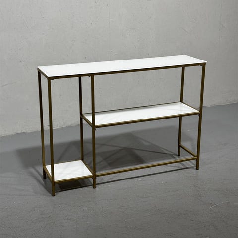 Kaunis konsolipöytä lasihyllyillä, sopii moderniin sisustukseen, metallikehykset kullanväriset